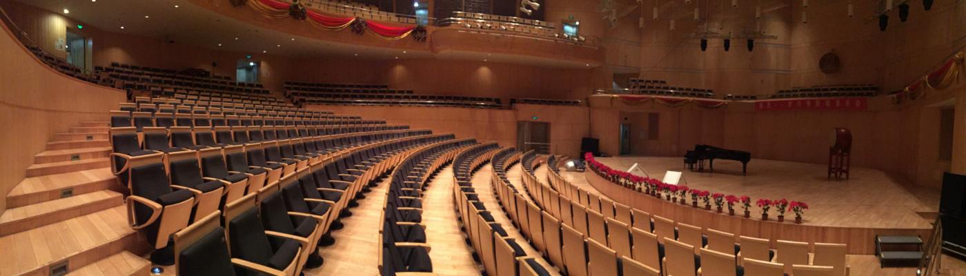 Tiered steps pointing towards a stage, on which a preacher stands.